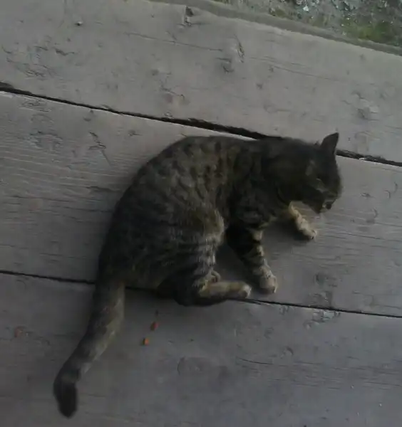 классическая серая полосатая. Возраст 9 лет. Особая примета - на брюшке
