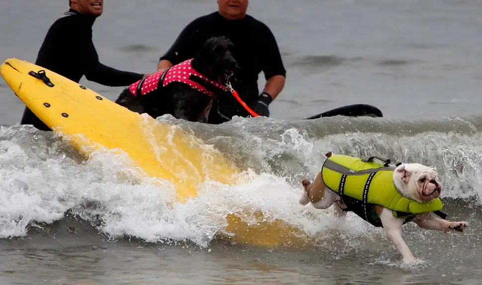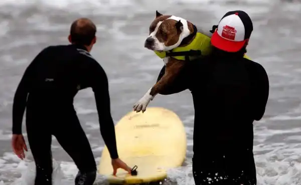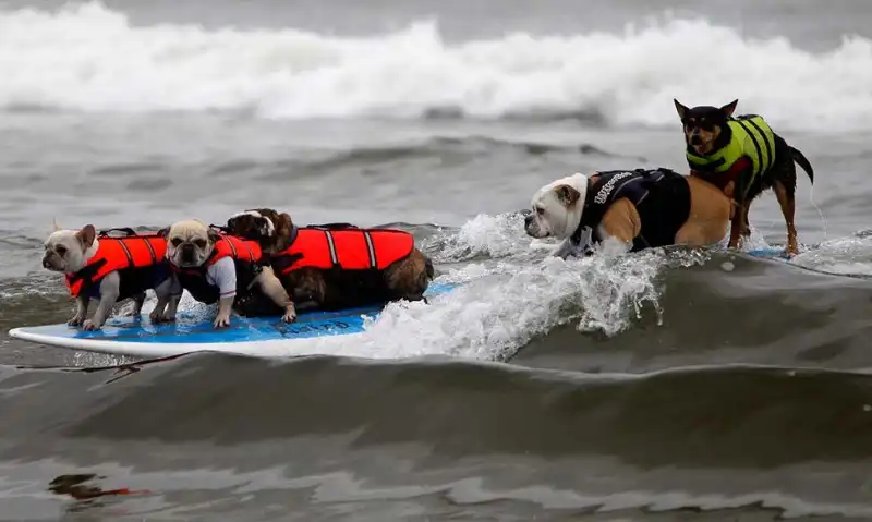 Около 20 собак участвовали в воскресенье в очередном соревновании по серфингу на пляже Хантингтон, в Лос-Анджелесе. Лабрадоры, боксеры, бульдоги, джек-рассел терьеры и другие породы собак – большие и маленькие – боролись за звание лучшего серфера на глазах многочисленных зрителей. Соревнование началось около 10 утра. У каждой собаки было минут 30-40, чтобы продемонстрировать свои умения. Их оценивали по многобальной шкале. Главной целью, конечно, было оставаться на доске и доплыть до берега. Делать это стоя на четырех лапах было куда труднее, чем лежа на доске. А катание задом наперед или спасение ситуации награждалось еще большим количеством очков.