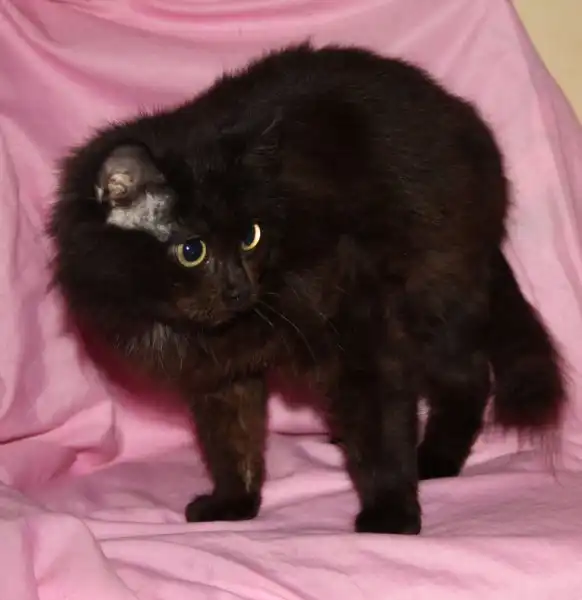 Черная, с шоколадным отливом, пушистая, судя по мордочке, в роду Скрипки
