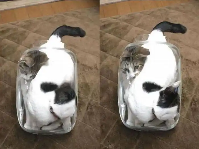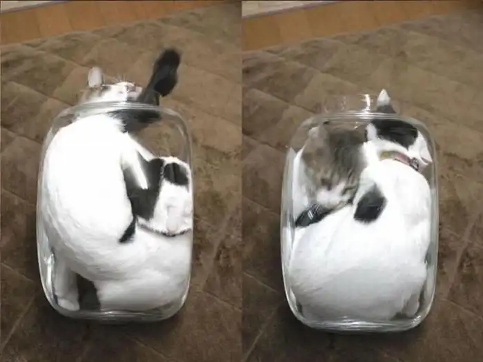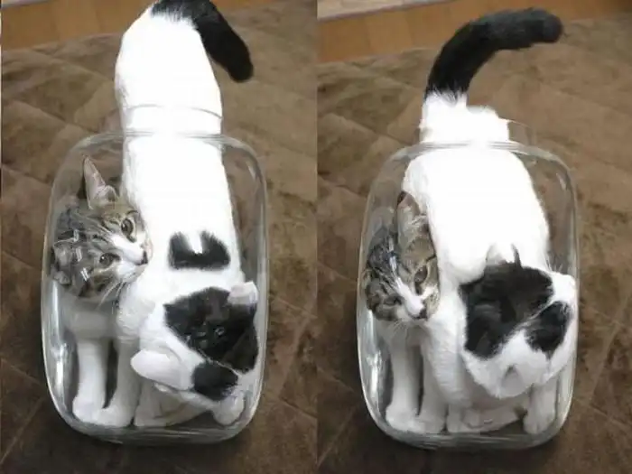 Котенок увидел, что его друг залез в банку, и не мог удержаться от соблазна составить ему компанию.