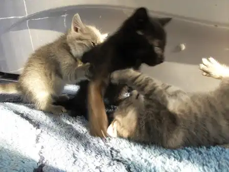 Котят нашли в мусорном контейнере, вот так просто, могла оборваться жизнь трех пушистых комочков. Но детки были рождены под счастливой звездой, и им встретились добрые люди, которые выходили и выкормили грудничков. Сейчас деткам 1,5 месяца, кушают прекрасно. 1 дымчатая девчушка, милейшее создание, спокойная, настоящая леди, и два сорванца дымчатый и черный - мальчишки. Озорным сорванцам так хорошо вместе, но, к сожалению, их придется разделять, семья не сможет оставить их у себя. Деткам ищутся самые добрые и ответственные хозяева, они очень ждут своих "маму" и "папу". Предоставляется 50% скидка на кастрацию/стерилизацию по достижению возраста!