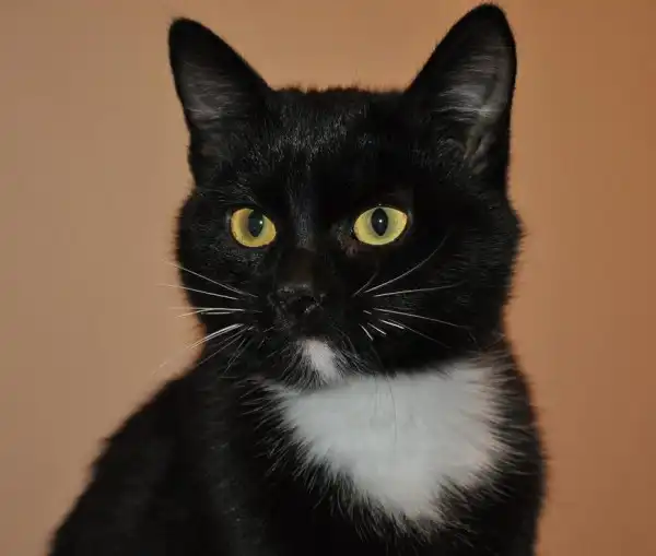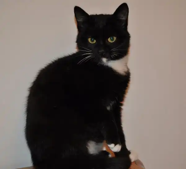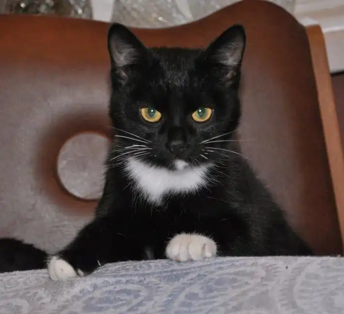 Черно- белая девченка, возраст 4 мес., носочки на всех лапах, глаза янтарные, взгляд суровый, была найдена в лесу, истощавшая была.