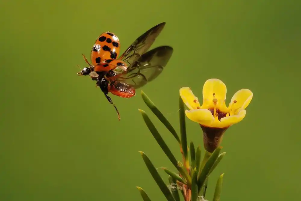 Студийная фотография азиатской божьей коровки. На цветок специально направили луч света, что привлечь внимание жучка и заставить его взлететь.