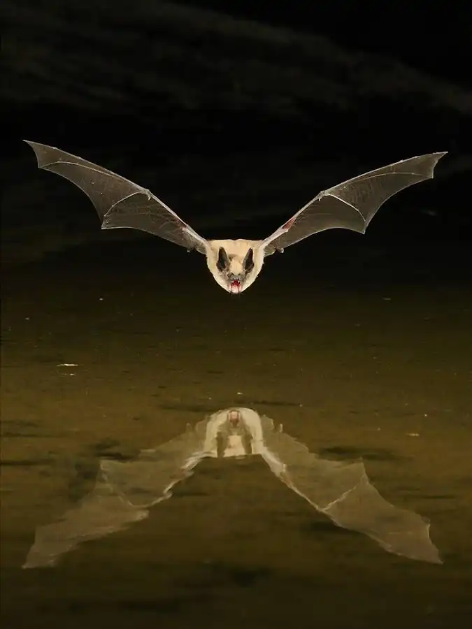 Летучая мышь в поисках добычи летает над искусственным водоёмом в пустыне Аризоны.