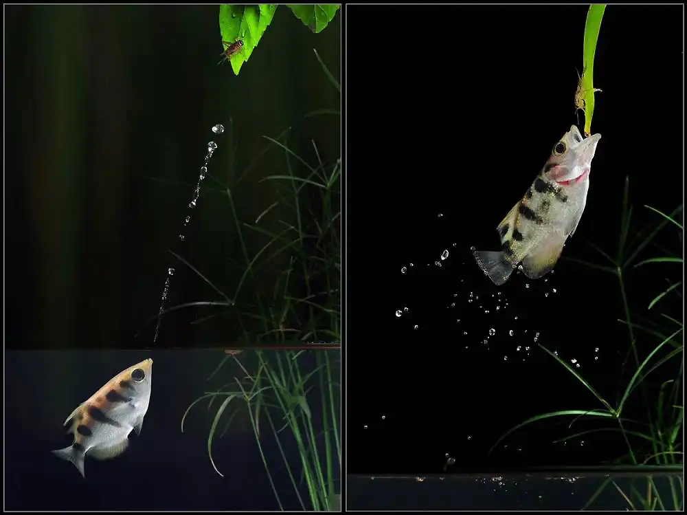 Рыба-брызгун выпускает изо рта струю воды, чтобы сбить с листика, а затем съесть зазевавшееся насекомое. Если такая рыба нацелилась на насекомое, то у него уже нет шансов спастись - рыба бьет практически без промаха на расстоянии почти в 2 м. А если насекомое сидит достаточно низко над водой, то рыба выпрыгивает и хватает неосторожного жука.
