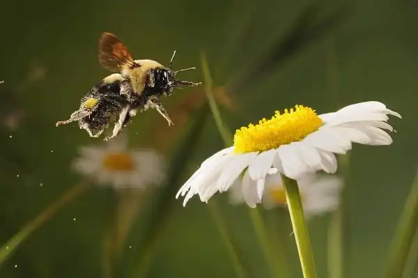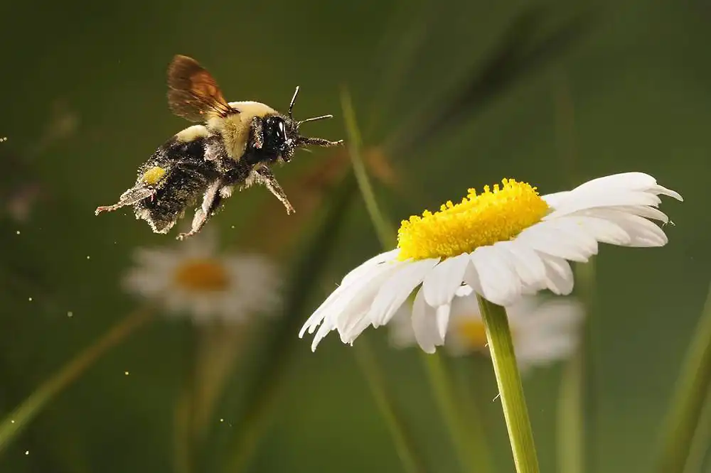 Студийная фотография посадки шмеля на ромашку. Ромашковый луг пришлось монтировать прямо на столе.
