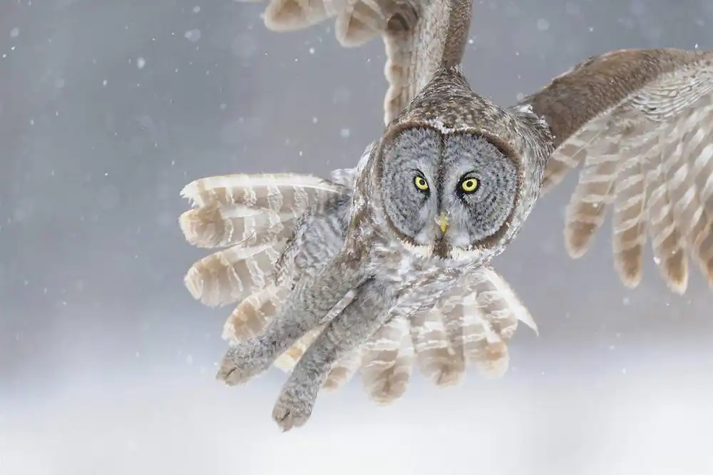 Полет большой серой совы. Эту великолепную птицу Скотт Линстед сфотографировал в Канаде. Снимок был сделан во время сильной метели, что придает изображению необычную атмосферу.