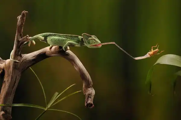 Система Phototrap, предназначенная для высокоскоростной съемки позволяет ловить события, длящиеся буквально доли секунды. Вот хамелеон выстреливает своим липким языком, чтобы поймать на обед кузнечика. Процесс выбрасывания языка занимает всего 1/20 секунды. И за это время Скотту Линстеду удается сделать четкий снимок.