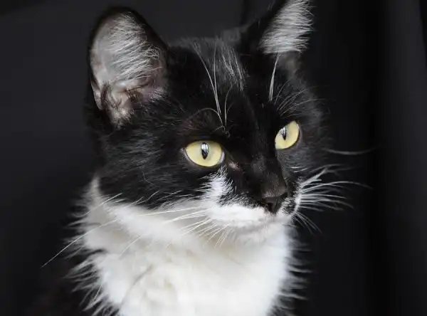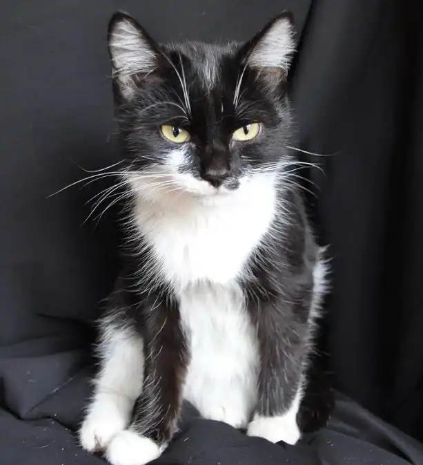 Окрас черно-белый, с белыми лапками и животиком, а на мордочке у него - белый бантик