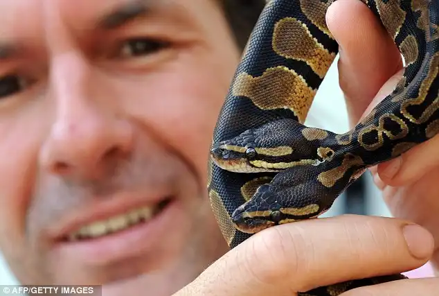 Его хозяин, заводчик змей Стефен Брукхаймер рассказал, что питону сейчас около года и он уже подрос до полуметра. Питоны этого вида водятся в Африке и могут вырасти до полутора метров. При опасности они сворачиваются в шар.
