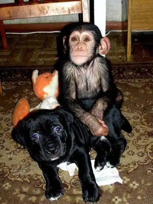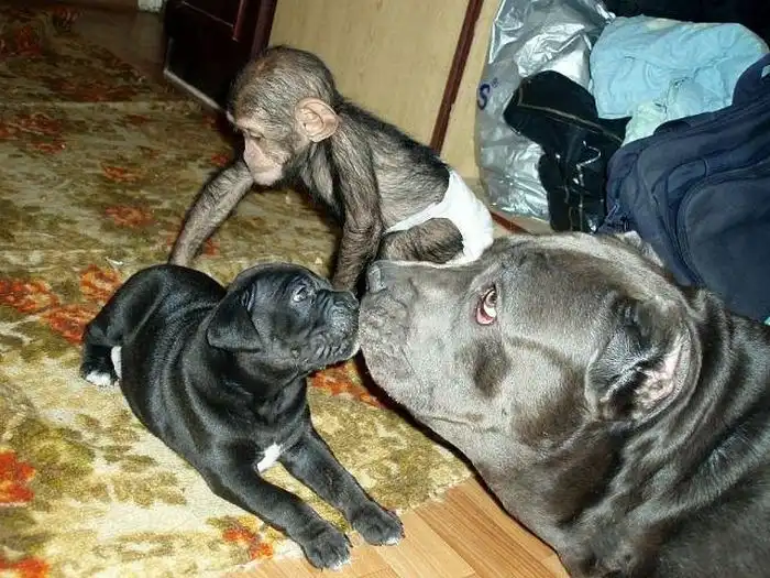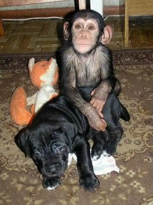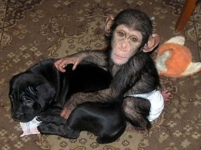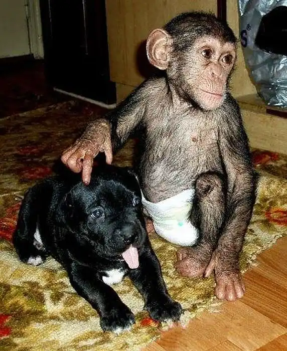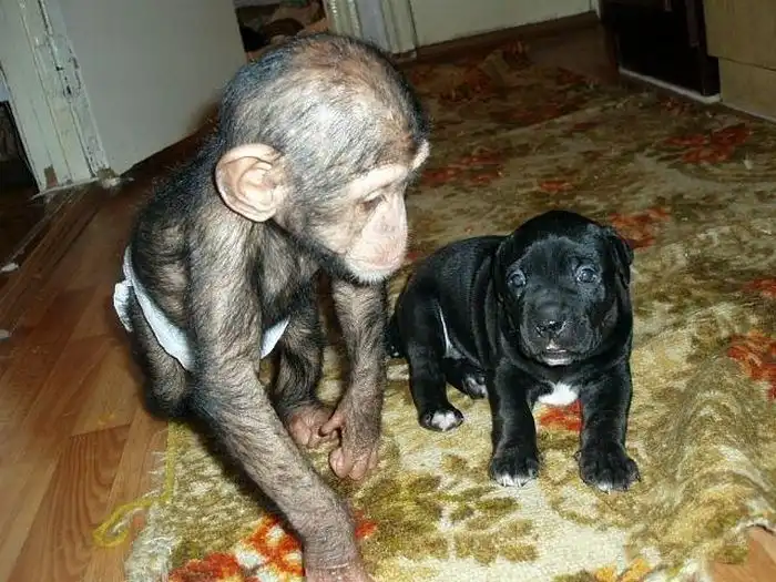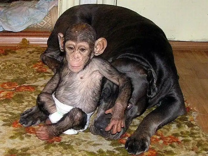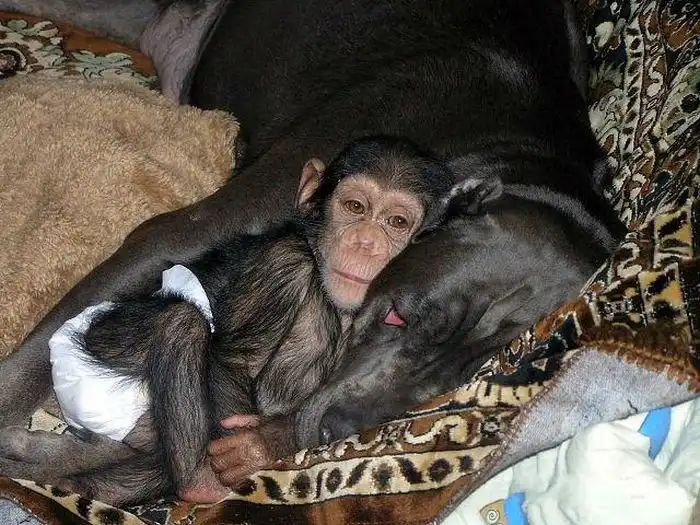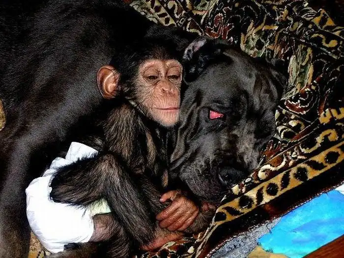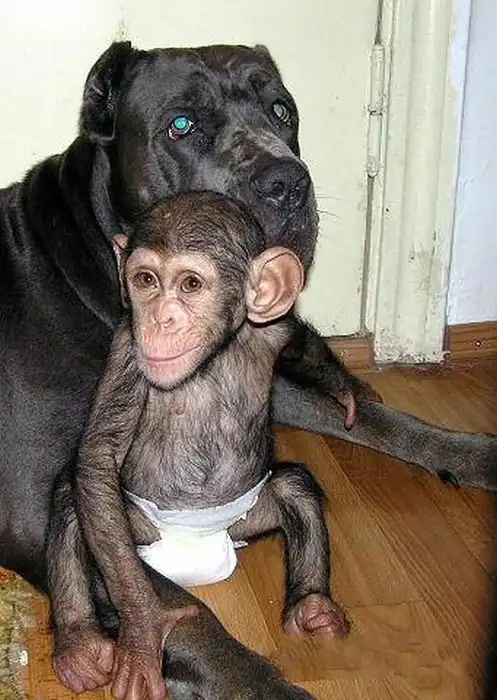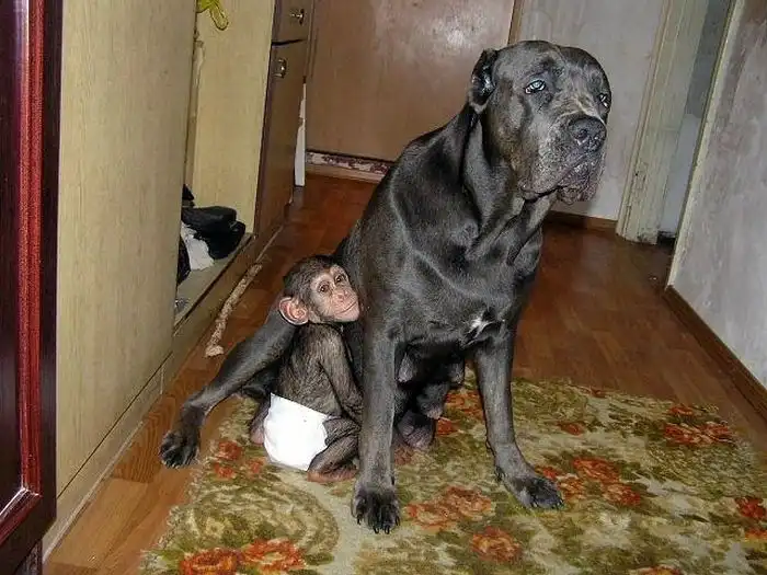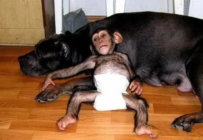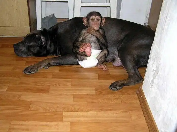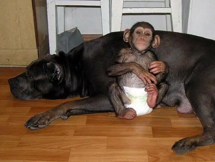Но кто бы знал, что настоящей мамой для шимпанзе станет большущая собака породы мастиф.