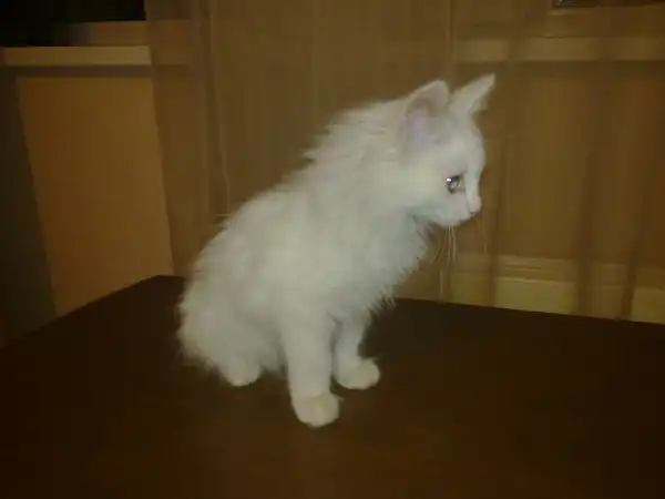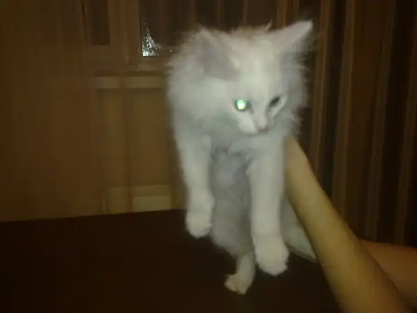 Белый пушистый котенок ищет своего хозяина