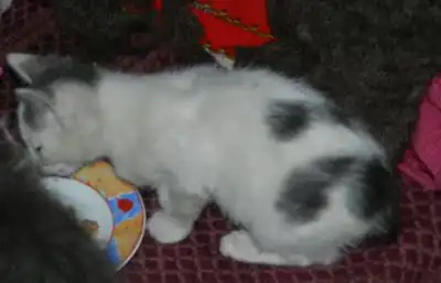 Первый котенок серый, мальчик, пушистый комок, примерно около 2 месяцев. Кушает все, ходит в лоток. Очень шустрый. Второй мальчик белый с серыми пятнами на голове, спине и серый хвост. Мне кажется будет гладкошерстным. Возраст около 2 месяцев. К лотку приучен, кушает натуральную пищу.