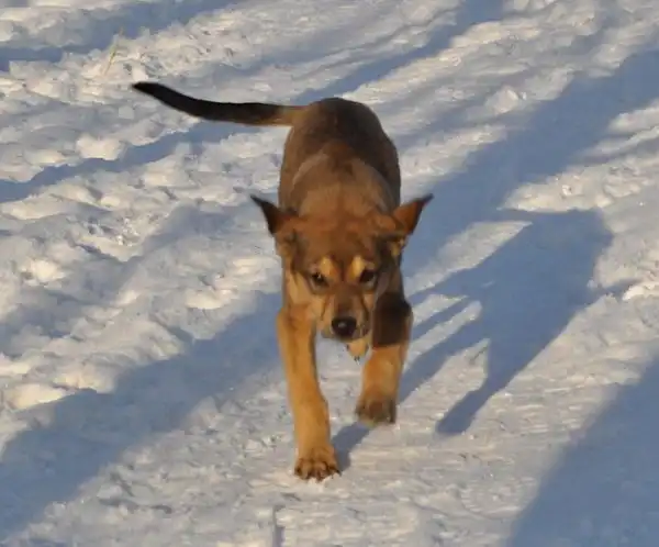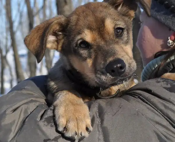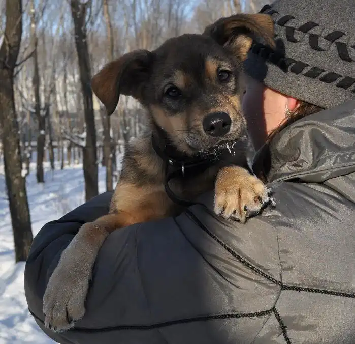 Щенку примерно 3,5 - 4 месяца (стали меняться зубки).