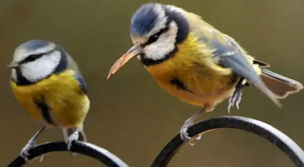 Слева обычная синица с обычным коротеньким клювом. Справа Клювик.