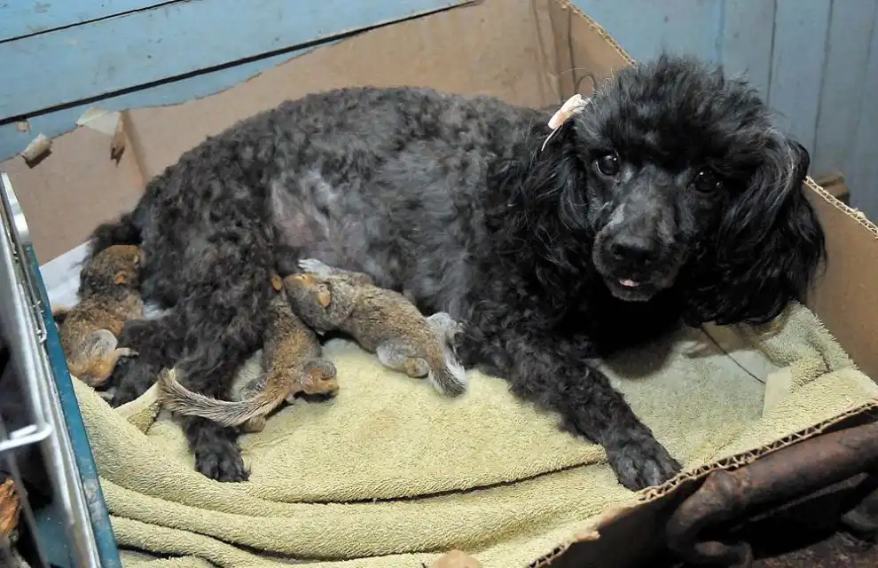 Когда дом этих бельчат спилили, пудель по кличке Пикси пришла на помощь. У Пикси еще оставалось молоко после рождения первого помета несколько месяцев назад, так что она приняла бельчат как родных. Она кормила их 5 недель, а потом эту роль переняли работники специального центра помощи животным, после чего окрепших и самостоятельных бельчат отпустили на волю.