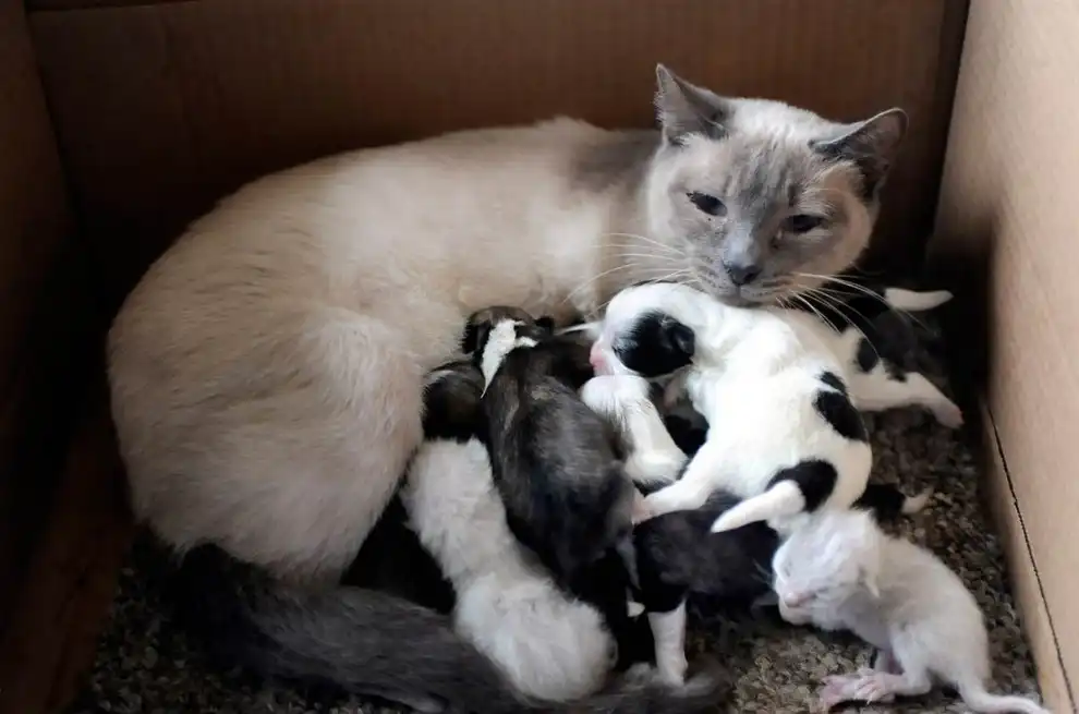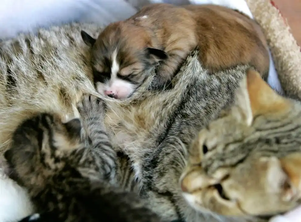 Если присмотреться, вы увидите, что эта сиамская кошка по имени Аманда кормит не только своих котят, но и чужих щенков. У Дебби Гиртинг из Бивера, штат Пенсильвания, помимо Аманды есть померанский шпиц Люси, которая родила семерых щенят в тот же день, что и Аманда – своих котят. К сожалению, через четыре дня Люси умерла из-за болезни, и Аманда стала мамой ее сироткам.