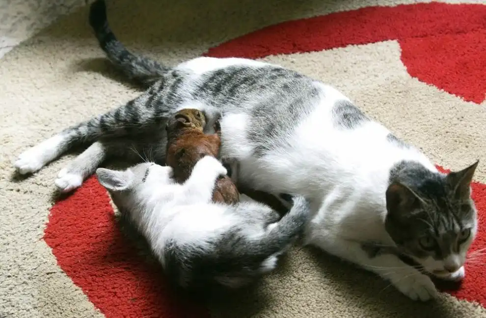 Кошка Тита стала мамой не только для своего котенка, но и для этого бельчонка, которого хозяйка Титы нашла раненым в своем дворе.