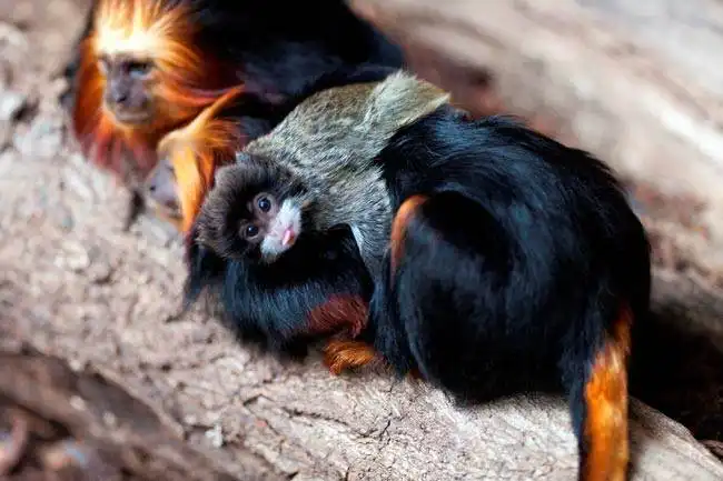 Самка львиной игрунки Хуанита из Лондонского зоопарка обладает настолько сильным материнским инстинктом, что с удовольствием приняла детеныша другого вида обезьян – императорского Тамарина. Хуанита начала носить его на спине повсюду.