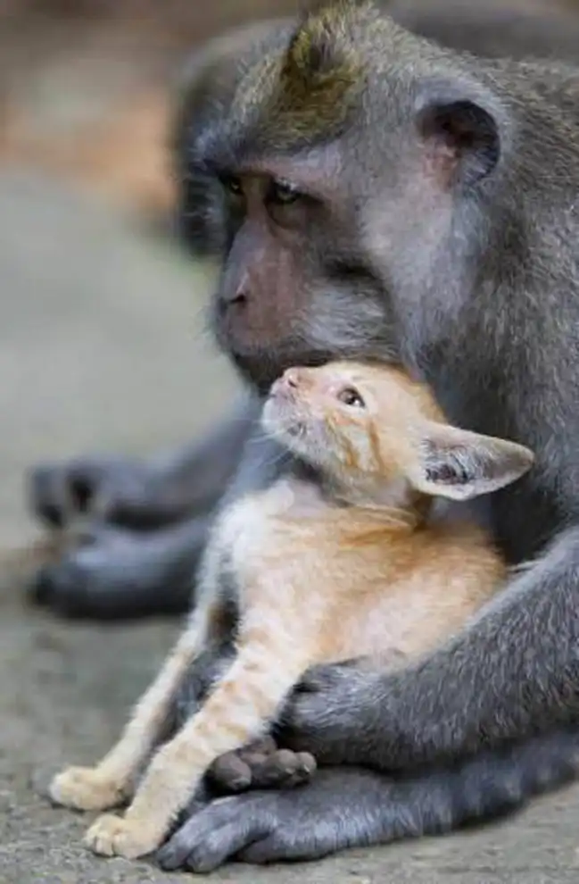У многих животных очень сильные родительские инстинкты. Возьмите хотя бы эту макаку с Бали, Индонезия. А ведь это даже не самка. Этот самец вызвал умиление всех любителей животных, когда принял на себя роль родителя для этого рыжего котенка.