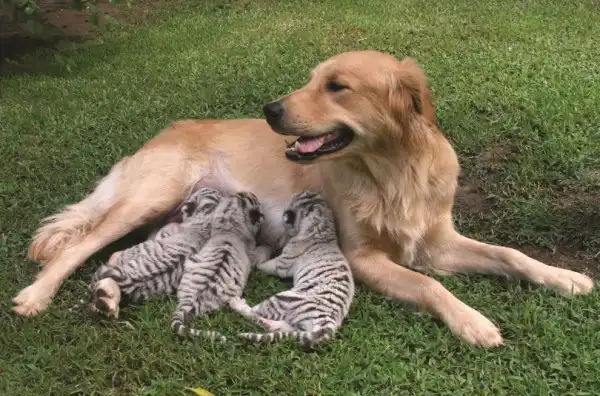 Изабелла – золотистый ретривер из Канзаса, которая приняла на себя роль мамы для трех детенышей бенгальского тигра. Тигрица-мать перестала кормить Насиру, Аньику и Сидани уже через 15 часов после рождения. Смотрителям зоопарка пришлось найти ей замену. Кажется, Изабелла, отлично справилась с ролью приемной мамы.
