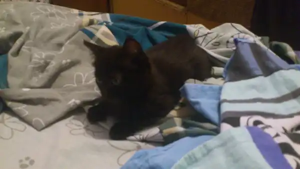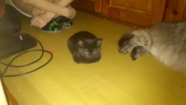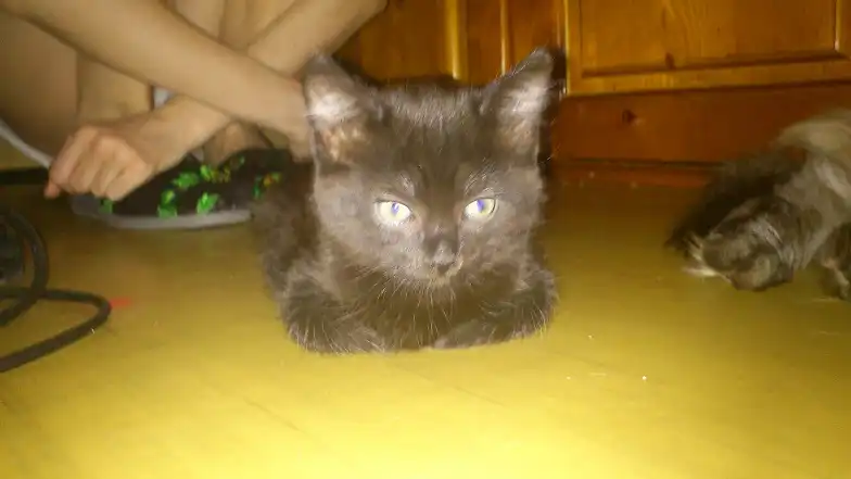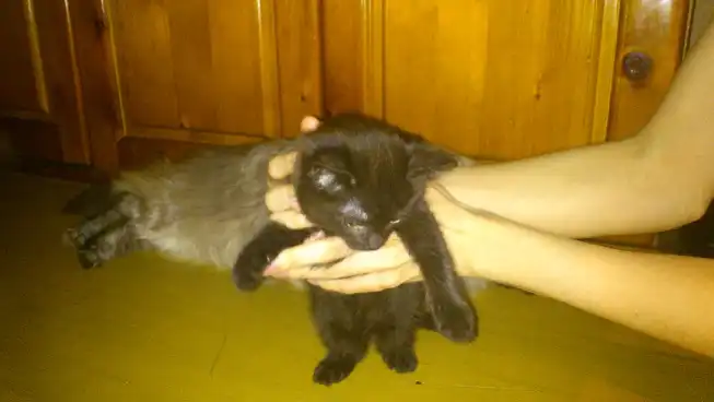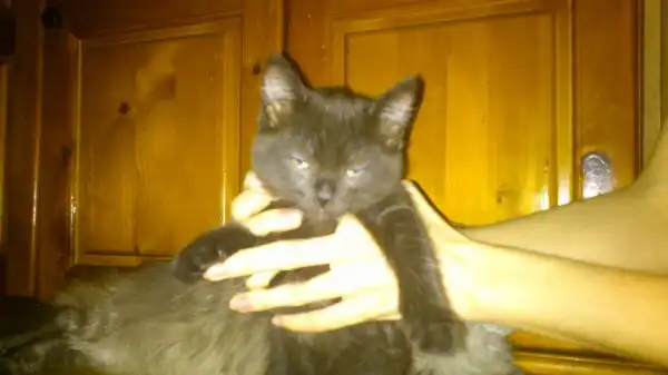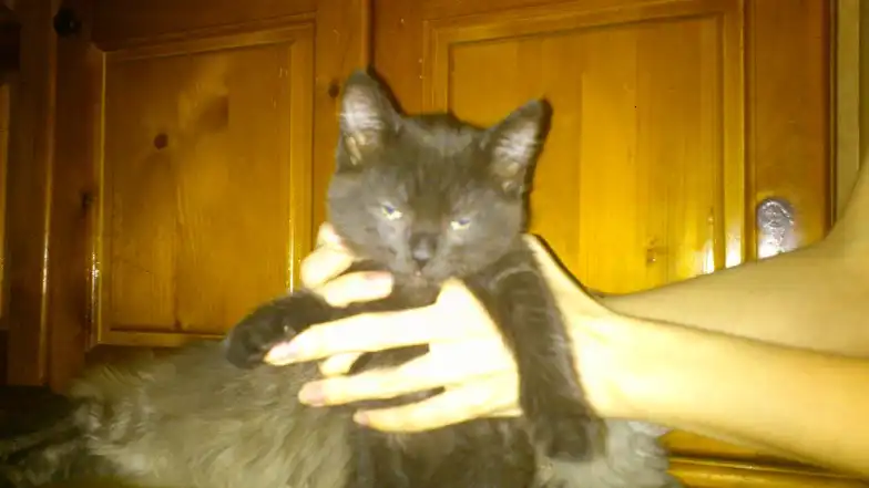 Нашла котенка!!! Утром выкинули буквально на глазах, только на слуху. Услышала хлопок дверью, а затем грустное мяуканье. Кто-то из "добрых" соседей выкинули малышку без сожаления в подъезд. Сразу же пошла и взяла к себе. Котенок девочка (вроде) на вид 1.5-2 мес., чистенькая. Себе оставить не могу, есть кот уже! Малышка всего боиться и шугается. Но если дарить ей любовь и ласку, то она отплатит тем же! Очень милый ребенок =) Окрас черный в черную полоску =)