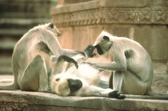 Эти лангуры Ханумана, как правило, живут по все Индии около храмов. Здесь они являются священными животными. Своим именем они обязаны богу Ханумана – смелому, сильному и хитрому. Обезьянки хоть и миролюбивы, но все время пытаются что-то утянуть, при этом им все сходит с рук, ведь они священны!