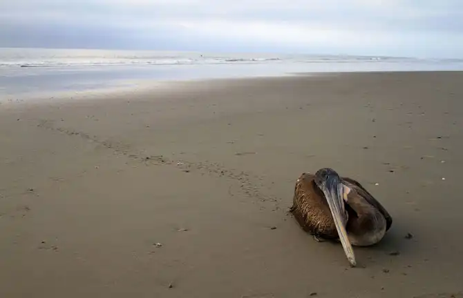 Умирающий пеликан. У побережья Перу произошла неизвестная экологическая катастрофа. На пляже в 1 100 км к северу от Лимы местные рыбаки нашли более 1 000 мертвых пеликанов. В живых остались всего несколько птиц, их состояние критическое и помочь им уже невозможно, 2 мая 2012.