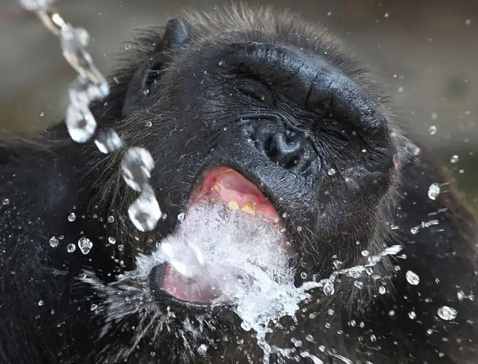 Жажда. Шимпанзе спасается от 40-градусной жары в Бангкоке, Таиланд, 26 апреля 2012.