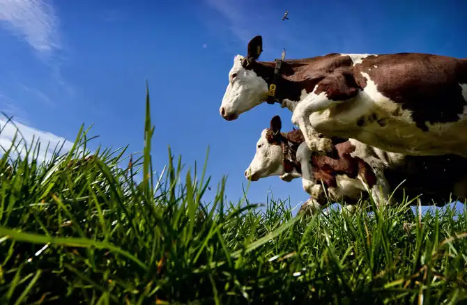 Соскучились по травке. После долгой зимовки в стойле, коровы первый раз вышли в поле и не скрывали своих эмоций. Нидерланды, 20 марта 2012.