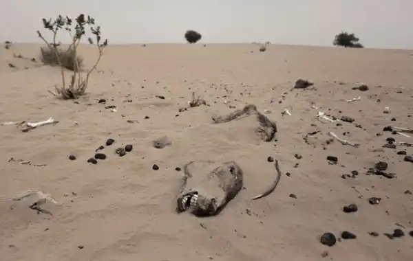 Мертвый осел в Сахеле — тропической саванне в Африке, которая протянулась на 3 900 км от Атлантического океана на западе, до Красного моря на востоке. Местные жители часто хоронят таким образом в пустыне умерших животных.