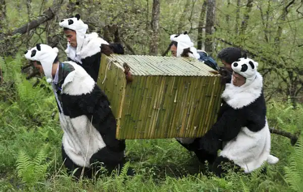 Ученые в защитных костюмах переносят 21-месячную большую панду Тао Тао из Центра охраны дикой природы в ее естественную среду обитания. По мнению исследователей, было принято решение надеть костюмы, чтобы уменьшить влияние человека на животное. Провинция Сычуань, Китай, 3 мая 2012