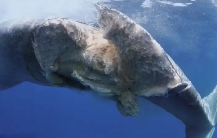 Раненный кит плавает у поверхности воды и ждет своего часа...