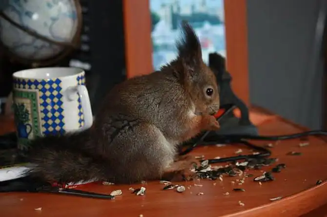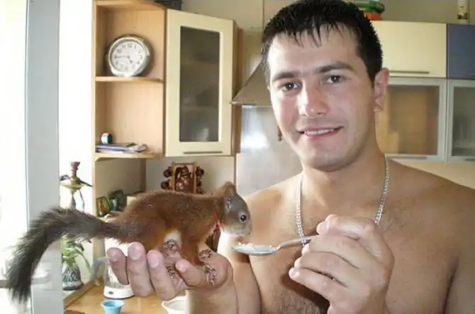 - Когда я служил в Марьиной Горке в спецназе прапорщиком, солдатики принесли мне совсем слабенького бельчонка. Был он тогда размером с пол-ладони, крохотный совсем, без сознания. Я у него из пасти достал семь червяков, и еще из глаза три. Сначала кормил его две недели детской смесью из шприца каждые 4 часа, а потом он окреп и стал пить молоко со смесью из ложечки. Через месяц стал давать ему семечки без скорлупы, а потом, когда появились зубки, он сам стал их щелкать. Так мы вместе с ним и служили — он у меня всегда за пазухой был.