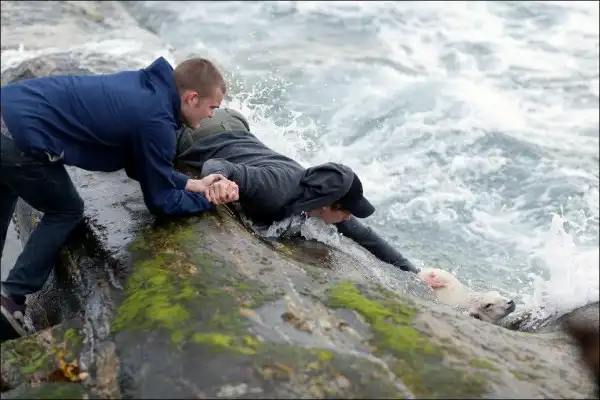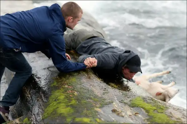 Ягненок подскользнулся на мокрых камнях и упал в море. Тут бы ему и конец пришел, если бы не подоспевшая вовремя помощь двух спасателей!