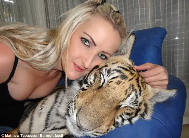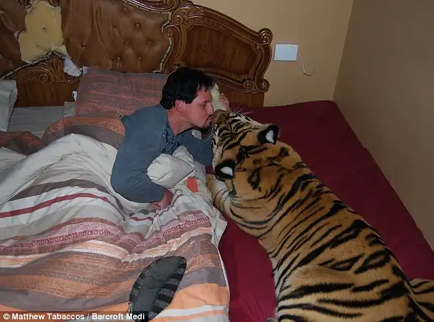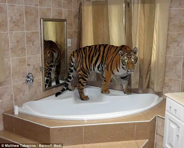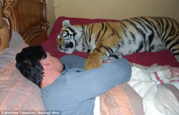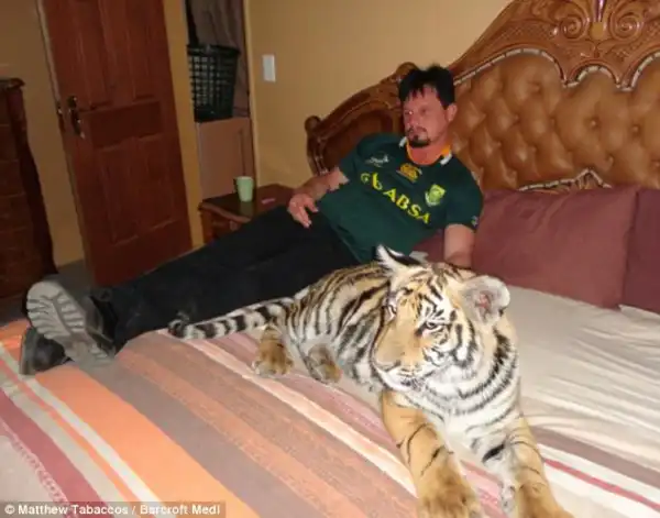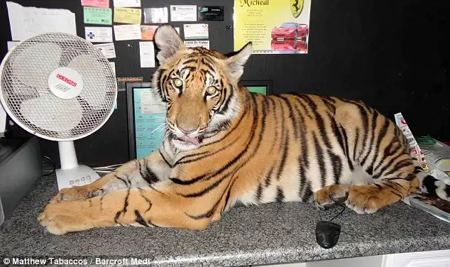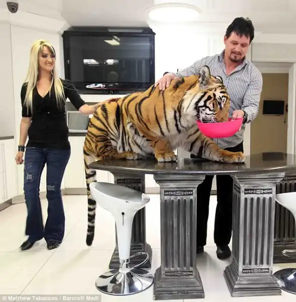 Но это не обычный годовалый домашний кот. Это 170-килограммовый бенгальский тигр, который живет у Майкла Джеймисона и его подруги Джеки Смит городе Бракпане в Южной Африке. У пары в доме кроме тигра живут еще 14 собак. Они купили Ензо 9-ти недельным котенком год назад и теперь он вырос в громадину, пожирающую 4, 5 кило мяса в день.