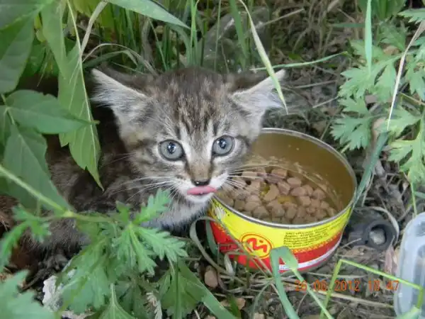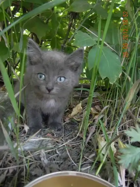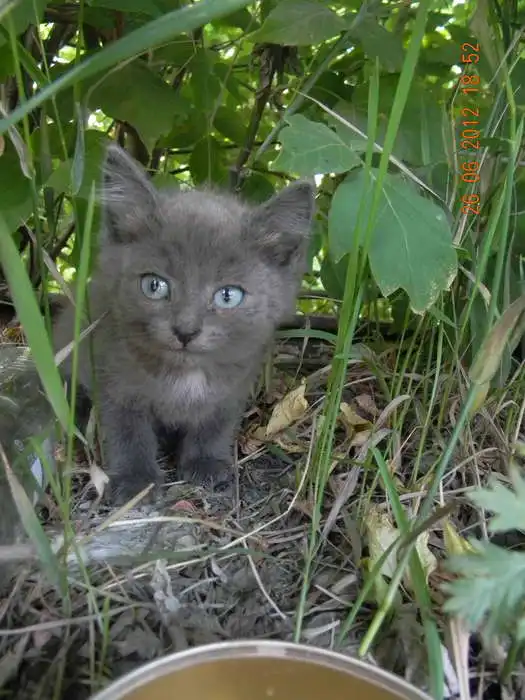 Сфотографировали, как могли - к людям относятся очень осторожно. Прячутся в кустах. Пол определить не смогли. Котята, похоже из разных пометов. Дымчатый - более крупный и меньше боится. Серенький в полоску - меньше. Пуглив.