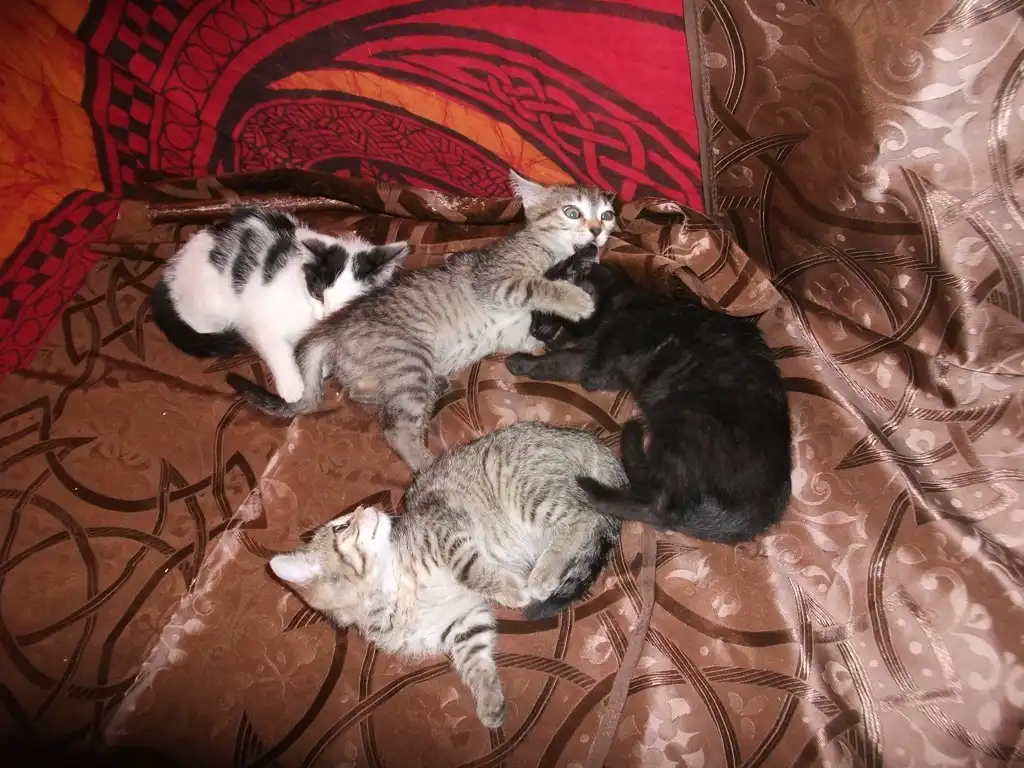 Белая девочка и полосатый мальчик активные котята. Черный мальчик и полосатая девочка спокойные.