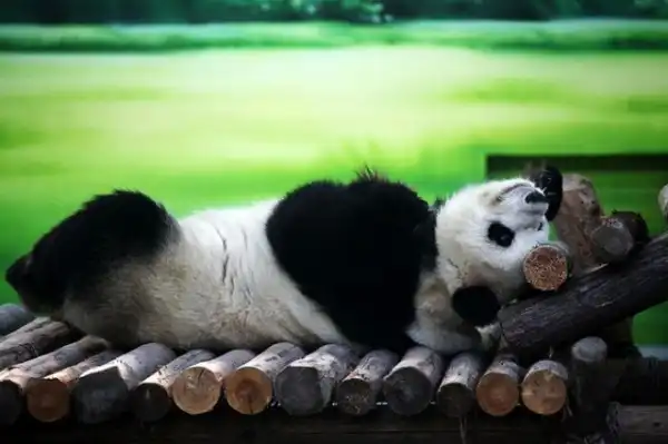 В китайском Национальном Парке живет удивительная панда. Дестилетний Синь Юэ любит совершенно по-человечески валяться на деревянном топчане.