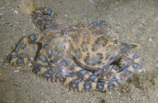 Синий кольцевидный Осьминог является маленьким, размером с мяч для гольфа, но чрезвычайно ядовитым существом, обитающим в прибрежных водах вокруг Австралии и немного севернее, в сторону Японии. Сине-кольцевидный осьминог обычно светлый по цвету, с темно-коричневыми группами по его восьми ногам и телу, с синими кругами, добавленными по верх этих темно-коричневых групп. Когда осьминог потревожен или вынут из воды, он темнеет, и кольца становятся блестящими и принимают цвет электрик, и именно это цветное изменение дает животному его название.
