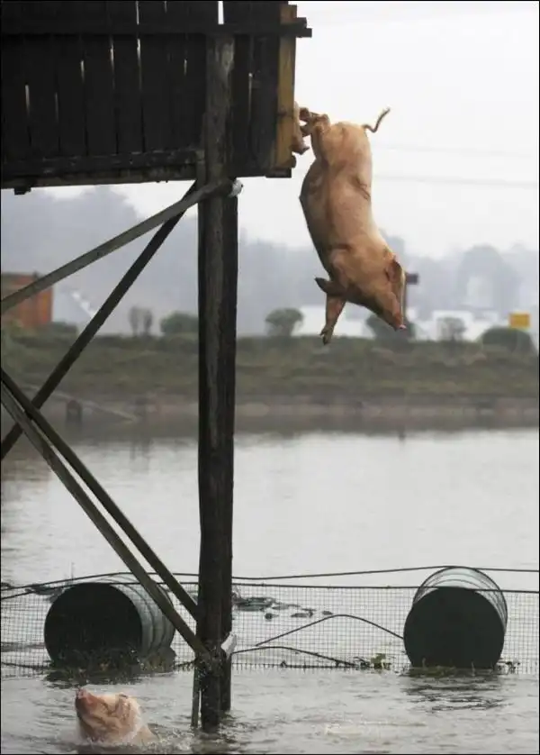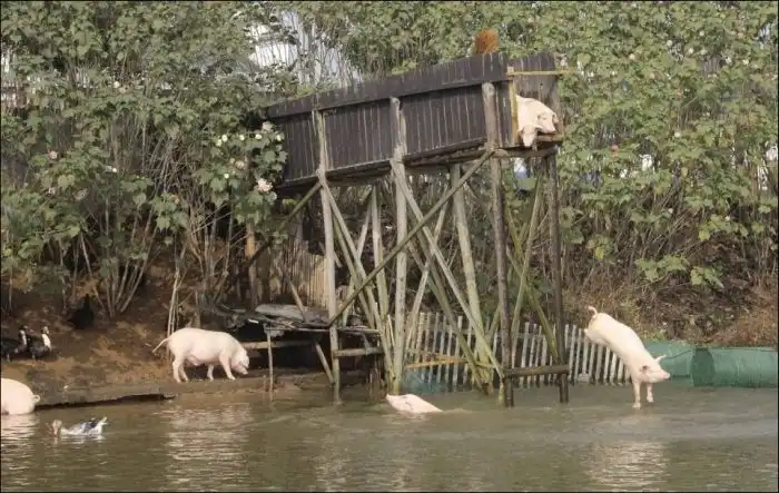 Поэтому он построил специальную вышку, с которой свинки с удовольствием прыгают в воду ;)