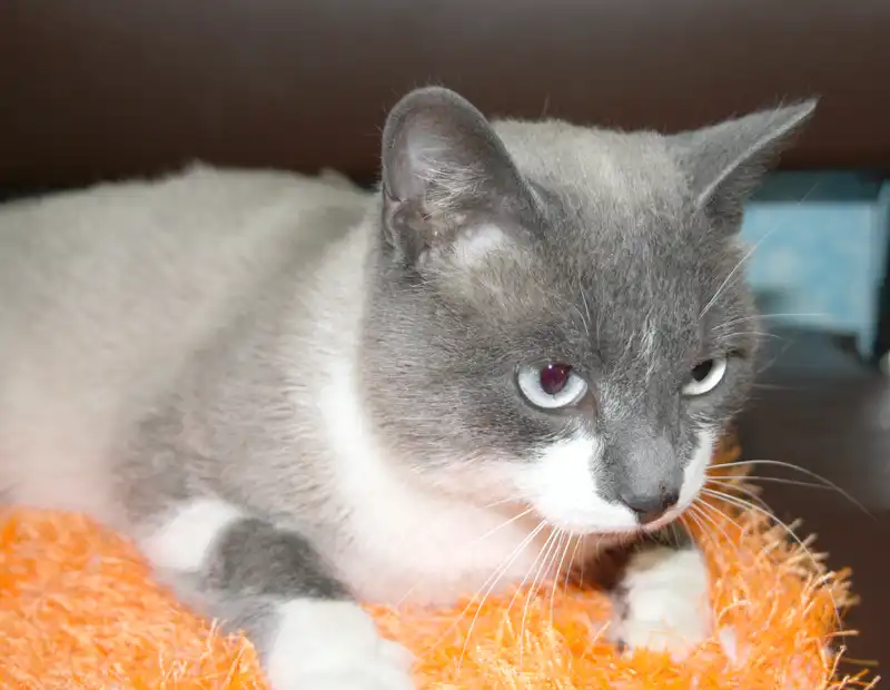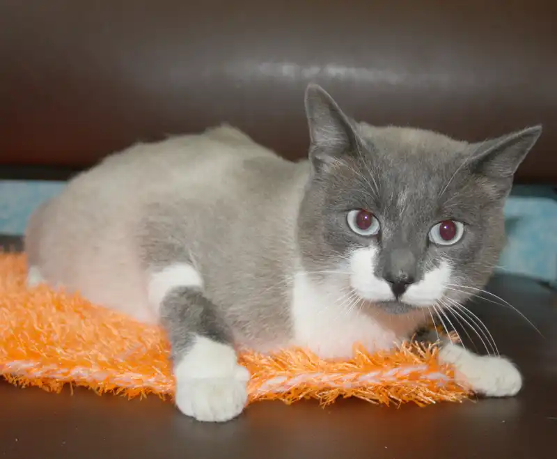 Котофей с очень необычной внешностью. Возраст примерно 1 год. Окрас блю-пойнт, но не классический, а со смешными белыми пятнами на носу, напоминающими усы. Характер твердый, настоящий комиссир, не любит, когда ему в чем-то мешают или кто-то что-то сделает не так, как он себе представляет. Соответственно, не любит других кошачьих, приближающихся к нему. Но не агрессивен к ним и к людям. Во всем соблюдает порядок, лотком пользуется отлично. Питается готовыми кормами. Будет рад стать единственным домашним любимцем. Кастрирован. Кот был найден холодным вечером дрожащим и пытающимся зайти погреться в магазин.