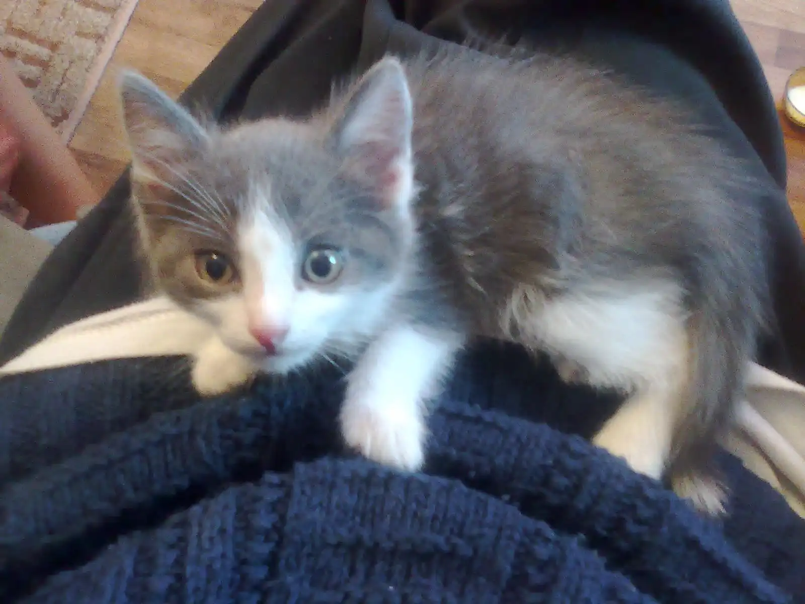 Серо-белого цвета: грудка, лапки и кончик хвоста белые. Оставили бы себе, да дома ремонт идёт...