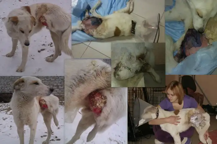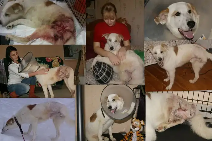 Это был бездомный пес, которого сбила машина. Из-за давности травмы - функцию лапы было не вернуть. (Проведено три операции в ноябре). Пес сейчас восстановлен, вообще - это ПОТРЯСАЮЩАЯ собака! Никакого негатива к людям - улыбается почти всегда и виляет хвостом. Очень ласковый, ручной-ручной и еще раз ручной, ценит доброе обращение, всегда готов облизывать лицо и быть рядом с вами, лишь бы не оставаться больше одному.