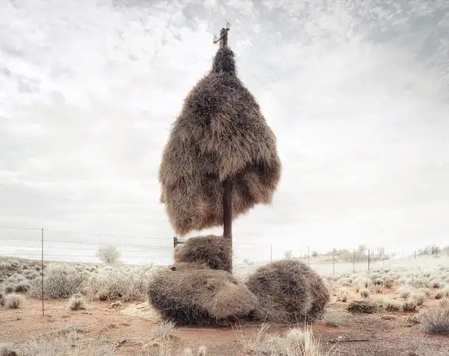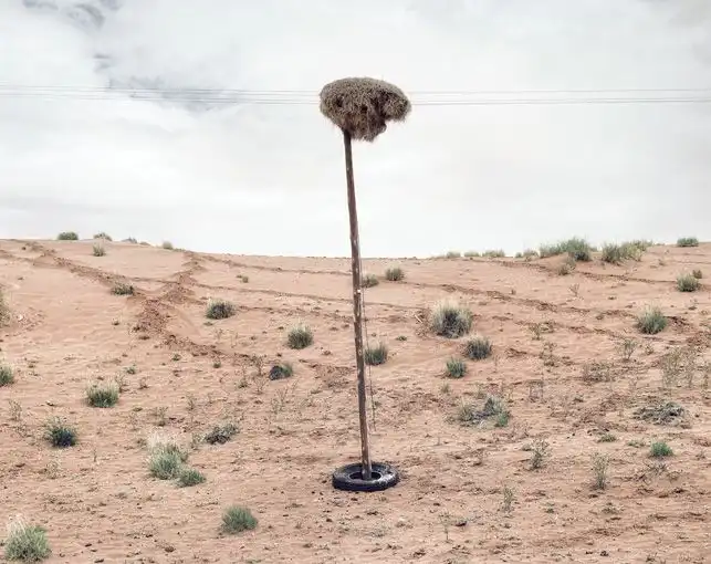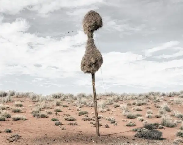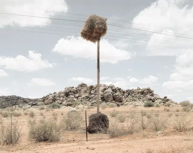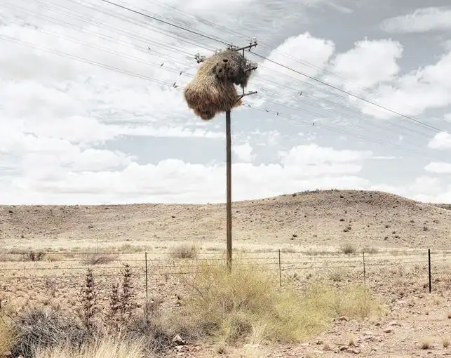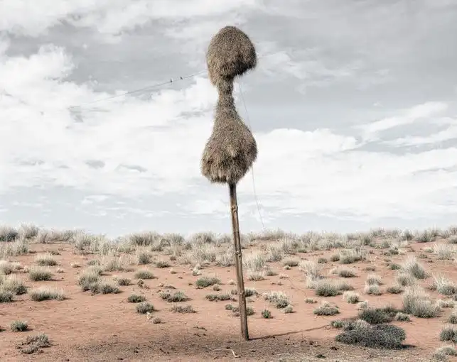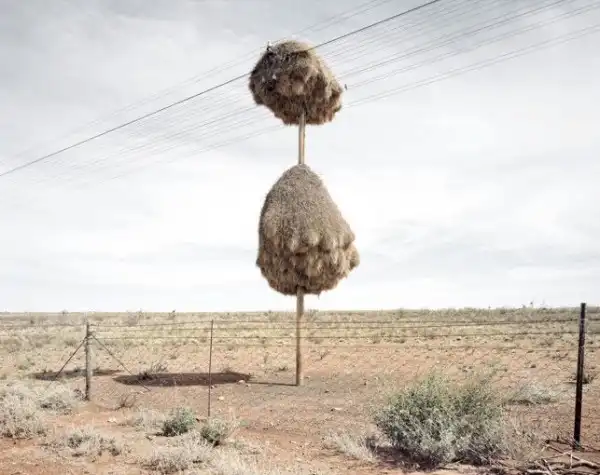 Пустыню Калахари в Южной Африке населяют интересные птички - обыкновенные общественные ткачи. Общественными их называют потому, что живут они в колониях. К тому же, у них нет территориальных претензий: они могут спокойно уживаться с другими видами птиц по соседству. Так вот, ткачи создают своеобразные общежития, которые растут с каждым годом. Фотограф Диллон Марш создал серию фотографий этих необычных домов, обустроенных на телеграфных столбах.