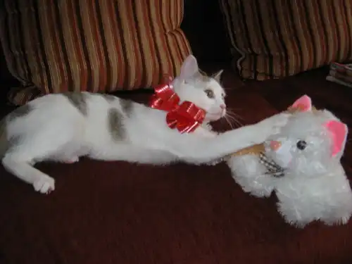 Это чудо появилось словно из ниоткуда… Поход за апельсинами для праздничного торта вечером накануне Рождества (6 января) не обещал ничего интересного… Однако, видимо, кошачий ангел на небе решил послать на землю своего слугу. И вот появилась она - кошечка Белка! Правда, была она в непрезентабельном виде - замерзшая, усталая и голодная. Пройти мимо нее было никак нельзя. С этих самых пор Белка поселилась в нашем доме. Очень быстро освоилась. Оказалась очень общительным, ласковым, но в тоже время деликатным существом. И правда, по характеру Белка - сущий ангел. Лоток она знает на 5+, питается кошачьим кормом - Royal Canin kitten 36.