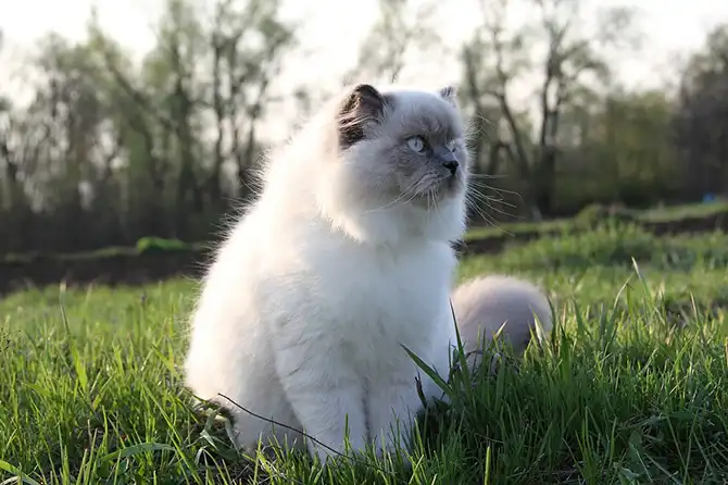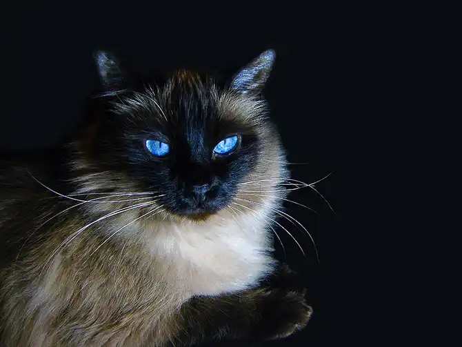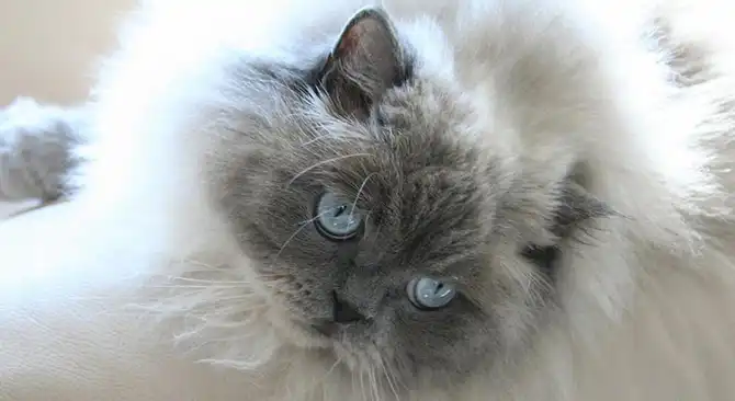 Схожая с персидской, гималайская кошка отличается голубыми глазами, неоднотонным окрасом колор-пойнт (светлое тело с более темными лапами, мордой, ушами и хвостом, как у сиамских кошек).