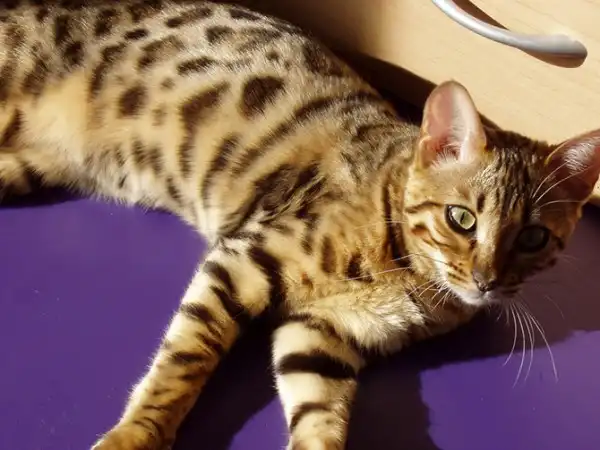 Встречается как полностью полосатый окрас, так и полосато-пятнистый, шерсть тойгеров очень мягкая наощупь, на свету отливает золотом.