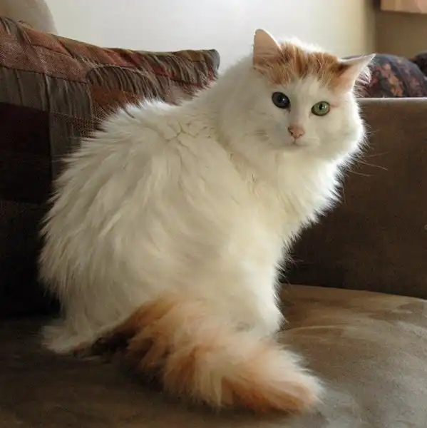 Тело ангорской кошки покрыто мехом средней длины, на хвосте же шерсть очень длинная, из-за чего он кажется очень объёмным. Обычно шерсть турецкой ангоры белоснежна, но встречаются и кошки с голубоватой, чёрной и рыжеватой окраской.