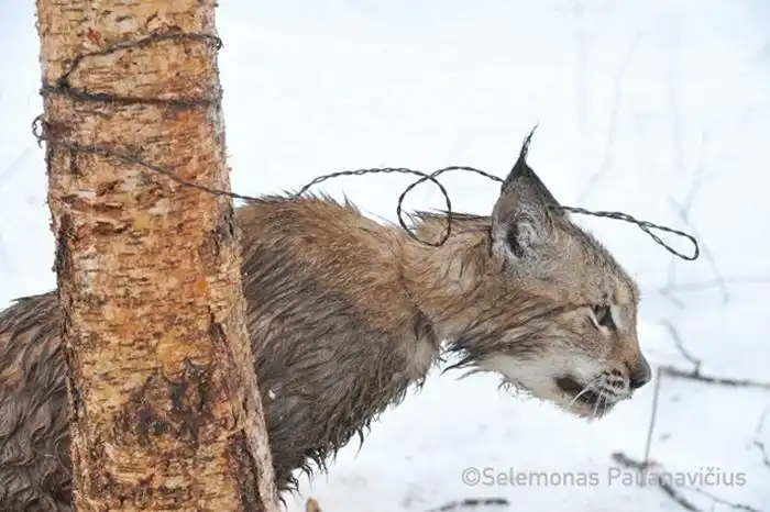 На месте происшествия лежали остатки зайца, видно, рысь попала в петлю, когда несла добычу.